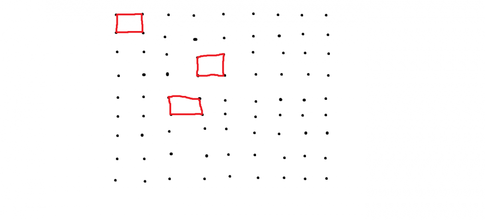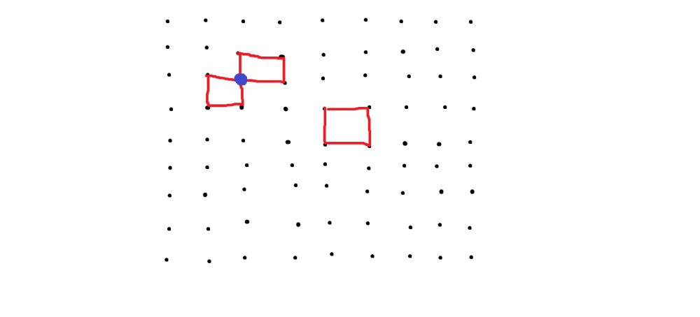 파란색 점에 정사각형 2개가 끼워졌기 때문이다. 돌리거나 뒤집어서 겹쳐져도 다른 것으로 볼 때, 총 몇 가지 경우의 수가 있는지 풀이와 함께 구하시오. (출제자도 답 모름)