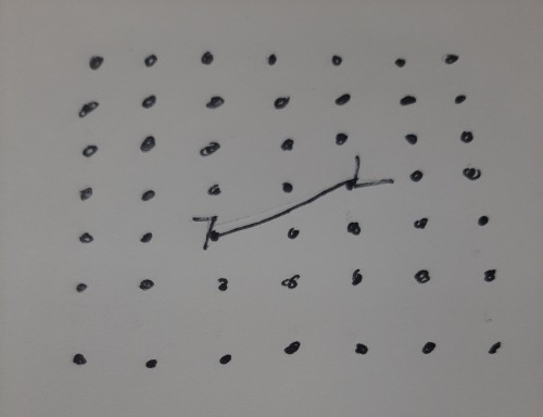 위와 같은 42개의 점이 있다. 이 점들은 수직, 수평 방향으로 같은 간격만큼씩 떨어져 있다. 이 점 중 하나를 꼭짓점으로 하고, 두점 ㄱ 과 ㄴ 을 이은 선분을 한변으로 하는 이등변삼각형은 모두 몇개 그릴 수 있는가?