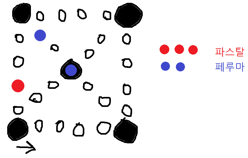 페루마는 파스탈과 윷놀이를 한다. 원래 윷놀이의 윷은 비대칭이라 엎어질 확률과 뒤집어질 확률이 다르다. 하지만 페루마는 윷이 없어서 윷이 필요 없게 윷놀이를 변형했다. 페루마는 동전 4개를 가져와서 앞면은 뒤집어졌다고 취급, 뒷면은 엎어졌다고 취급했다(즉, 도는 1개가 앞면, 개는 2개가 앞면, 걸은 3개가 앞면, 윷은 전부 앞면, 모는 전부 뒷면). 페루마와 파스탈이 일명 '동전 윷놀이'를 하고, 거의 막판에 아래와 같이 되었다. 파스탈은 빨강, 페루마는 파랑이다.