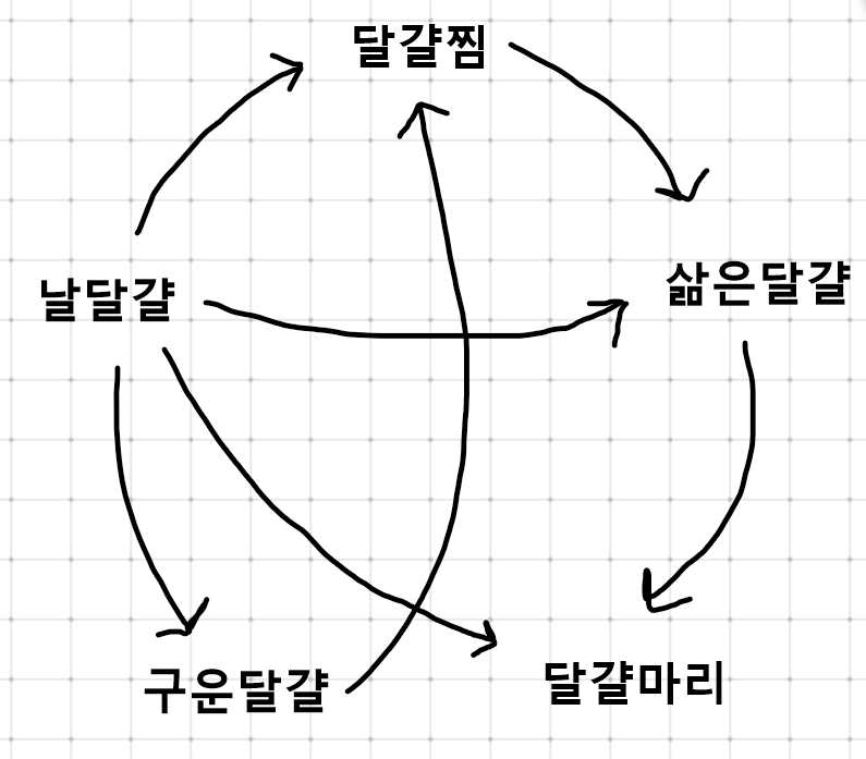 (2) 구운달걀이 달걀찜이 되는 진화 과정과 달걀찜이 삶은달걀로 진화하는 경로가 없어졌다.