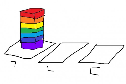 3. 블록을 옮길 때 아래의 무지개 색 블록은 위의 무지개 색 블록보다 위에 올 수 없다.