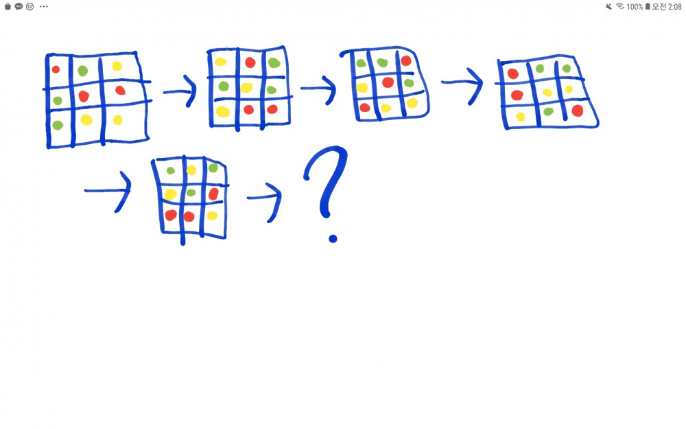아래 그림처럼 일정한 규칙으로 정사각형의 색깔이 바뀌고 있다. ?에 들어갈 색깔을 그리고 규칙이 무엇인지 쓰시오.