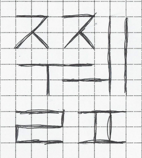 비퀴에 잉크를 묻히고 굴러다니며 글씨를 쓰는 로봇이 있다. 땅에 붙어서 글씨를 쓰며 이동할 때 1 m당 1만큼 배터리가 줄어들고, 글씨를 쓰지 않고 점프해서 이동하면 1 m당 5/3의 배터리가 소모된다. 아래 모눈의 한 칸이 모두 1 m일 때, 배터리 사용량을 최소화할 수 있는 경로와 그떄의 사용량은 얼마인가? (글씨가 이미 써진 곳을 또 이동해도 괜찮지만, 글씨는 반드시 정해진 길이만큼 모두 움직여야 하며, 글씨가 없는 곳에 선을 그으며 움직이면 안 된다.)
