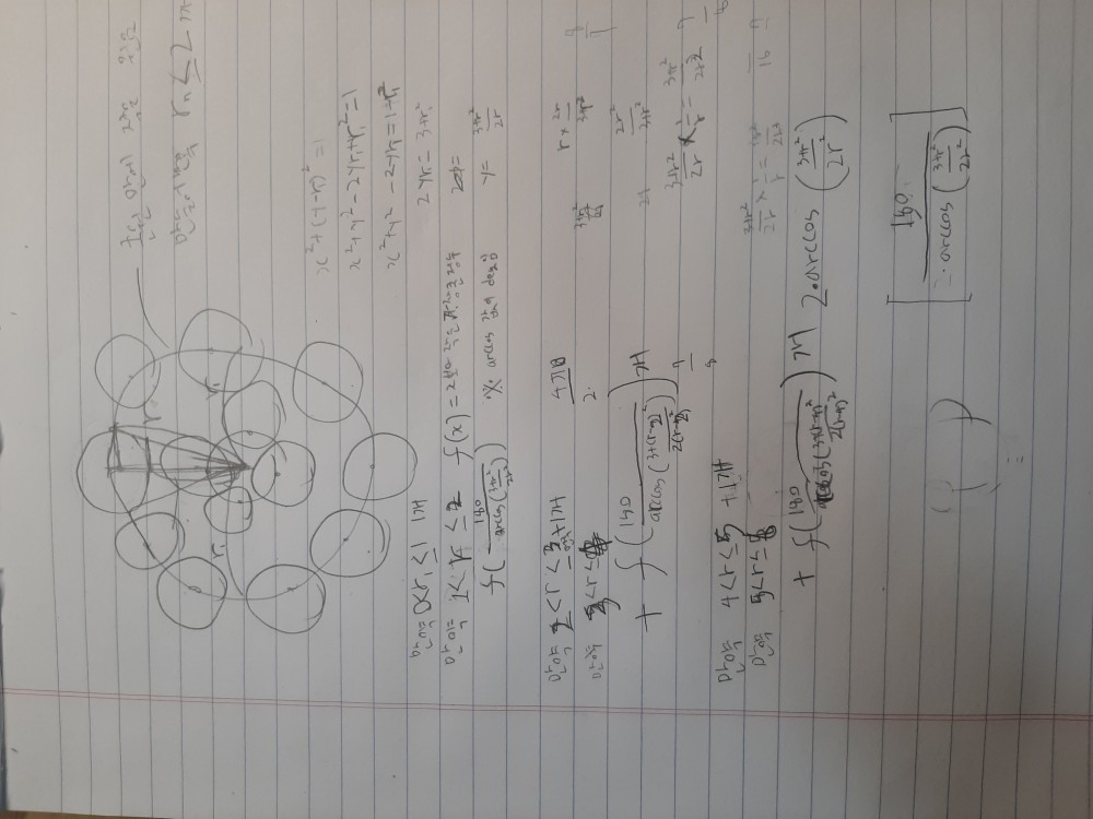 먼저 저 식이 나온 과정이 분명하지 않습니다. 작은 원의 크기를 구해서 1-1의 방법을 사용하여 구한 것 같은데, 식을 유도한 방법을 좀 더 분명히 나타내 주시면 좋을 것 같습니다.