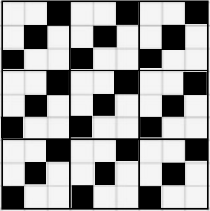 둘째, 굵은 정사각형 9개 중 채워진 숫자의 모양이 같은 것이 가장 많도록 할때 최대 몇 개일까요?