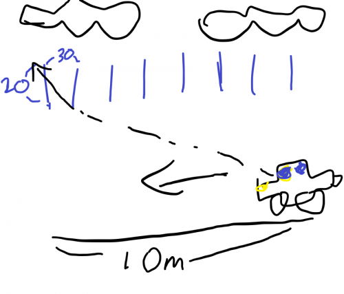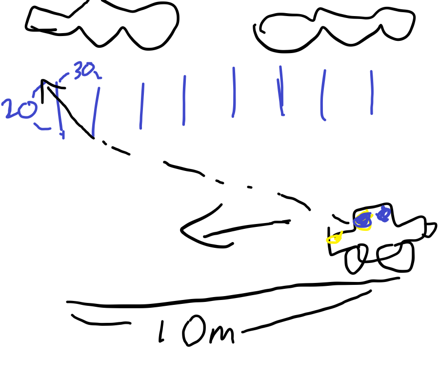 한 터널이 있다. 이 터널의 천장에는 세로로 20cm길이의 틀들이 있는데, 각각 30cm씩 떨어져 있다. 이때, 하늘이 보이는 가장 앞쪽의 거리를 구하여라 (터널의 길이는 10m이며, 차는 터널의 입구에 있다. 그리고, 시선은 땅으로 부터 1m 올라간 곳에 있으며, 천장과 땅의 거리는 5m이다.