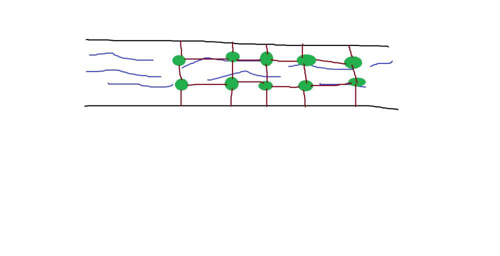 아래 강에 섬이 몇 개 있고 다리가 연결되어 있다. 그런데 태풍이 불어 다리 몇 개가 무너졌다. 각각의 다리가 무너질 확률은 2분의 1일 때, 남은 다리로 강을 건널 수 있을 확률은 얼마일까? (수영해서 건너기 없기!)