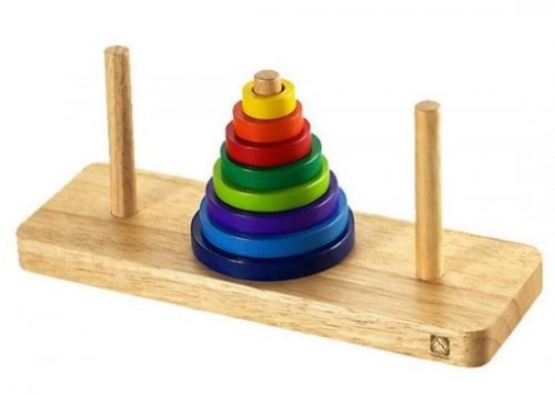 이씨가 하노이의 사원에 갔다 오면서 하노이 탑 장난감을 사왔다. 하노이 탑은 판 위에 세 개의 막대기가 새워져 있으며 왼쪽끝 막대에는 8 개의 원판이 밑에서부터 큰 순서로 끼워져 있다.이 원판을 똑같은 모양으로 왼쪽 끝까지 욺 기려고 한다. 단, 한 번에 한 개의 원판만 움직일 수 있고 작은 원판 위에 큰 원판이 올라갈 수 없다. 8개의 원판을 욺 기는데 걸리는 최소한의 이동횟수는 몇 회일까?