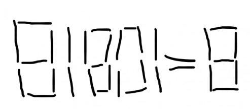 위 그림에서 성냥개비 4개를 움직여서 등식을 성립하게 하여라. (단, 등호는 건드릴 수 없고 4개를 모두 움직여야 한다)