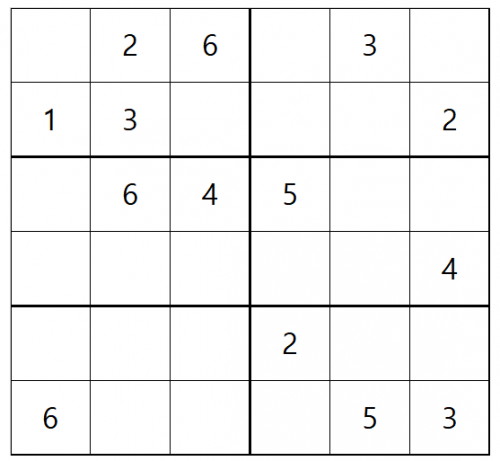 1부터 6까지 수를 가로, 세로, 2*3 직사각형에 한번씩 들어가도록 스도쿠를 완성하시오.