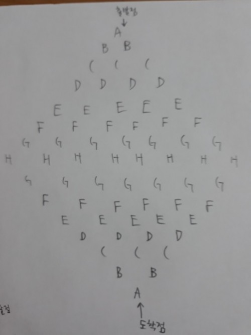 여기서 맨 위의 A에서 맨 아래의 A까지 가는 경로의 수를 구하여라.(단,한번 지나간 지점은 다시 지나갈 수 없고,왼쪽 아래 방향으로만 가거나 오른쪽 아래 방향으로만 갈 수 있다.)